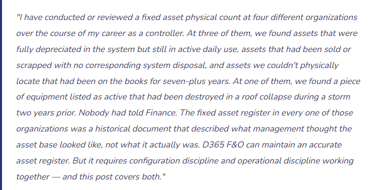 D365 F&O gives you the tools to keep it accurate — multiple books for different reporting purposes, a full transaction audit trail, automatic depreciation calculation, and reconciliation reporting that flags discrepancies before they accumulate. The tools are there. Using them requires a few solid habits and a communication process between Finance and the people who physically work with your assets every day. Those habits and that communication process are worth building from day one of go-live. The alternative is a register that describes an organization that hasn’t quite existed for several years, discovered at the worst possible moment by your auditors.