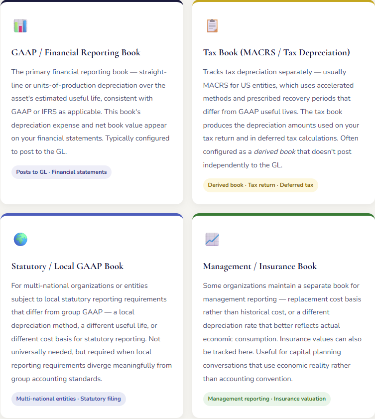 In practice, the complexity comes from a few places. First, most organizations need to track assets differently for different purposes simultaneously — GAAP book depreciation for financial reporting, MACRS accelerated depreciation for tax returns, and sometimes a third set of records for statutory or management reporting. D365 F&O handles this through the concept of multiple value models (called books in current terminology) attached to each asset, each with independent depreciation schedules. Understanding how books work is the foundational concept that makes everything else in this module make sense.