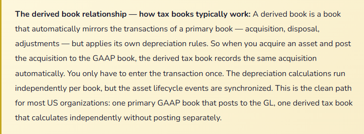 Each book attached to an asset has its own service life, its own depreciation method, its own convention setting, and its own posting profile — which means depreciation from the GAAP book posts to your depreciation expense account on the income statement, while the tax book either posts nowhere (if it’s a derived non-posting book) or posts to a separate set of tax-basis accounts. You get one physical asset register with multiple simultaneous accounting views. This is the feature that makes the Fixed Assets module genuinely powerful for organizations with multiple reporting obligations.