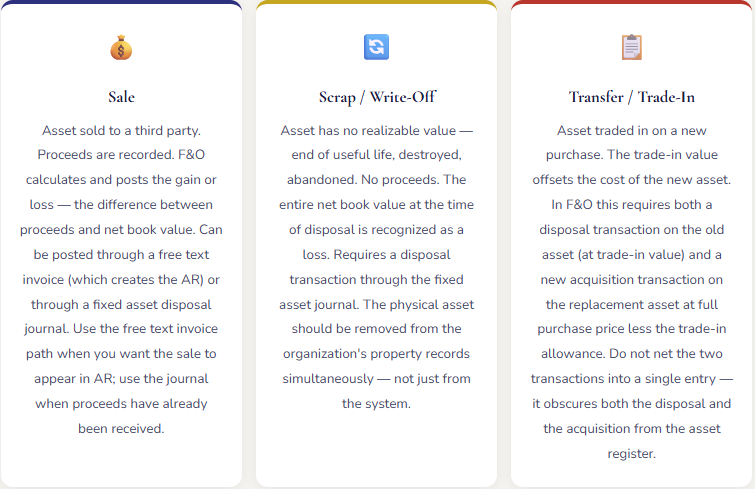- When an asset leaves the organization — sold, scrapped, abandoned, destroyed, traded in — the disposal must be recorded in F&O through a disposal transaction that removes the gross asset cost and accumulated depreciation from the balance sheet, records any proceeds received, and posts the resulting gain or loss to the income statement. Failing to record a disposal leaves a fully depreciated ghost asset on the books — it doesn’t affect current depreciation expense (there’s nothing left to depreciate), but it overstates gross asset cost and accumulated depreciation indefinitely and creates confusion during physical counts and audit procedures.