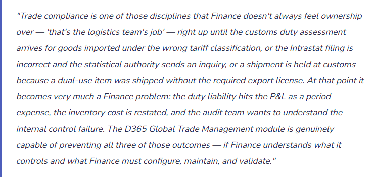 Trade compliance addresses the boundary of the supply chain. The next post looks deeper into how D365 F&O manages the vendor relationship before goods even arrive: Vendor Collaboration and Advanced Procurement Workflows in D365 F&O — the vendor portal, purchase agreements and trade agreement pricing, requisition and procurement policies, consignment inventory accounting, and the three-way match controls that prevent AP from paying for what wasn’t received at the price that wasn’t agreed.