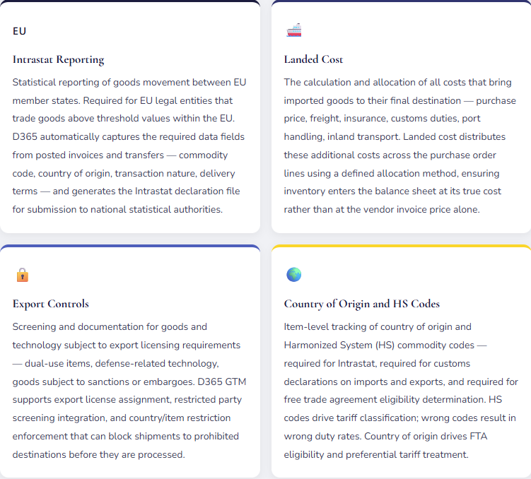 Intrastat reporting for EU entities, import/export controls, country of origin and HS code tracking, dual-use item classification, landed cost calculation and duty accruals, free trade agreement eligibility, and the Finance setup that ensures trade compliance costs land in inventory cost rather than in a period-end surprise journal.
