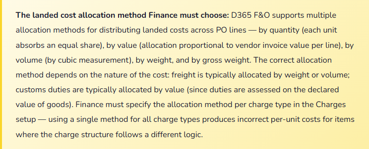 • Use a single landed cost allocation method for all charge types — freight logic and duty logic follow different bases