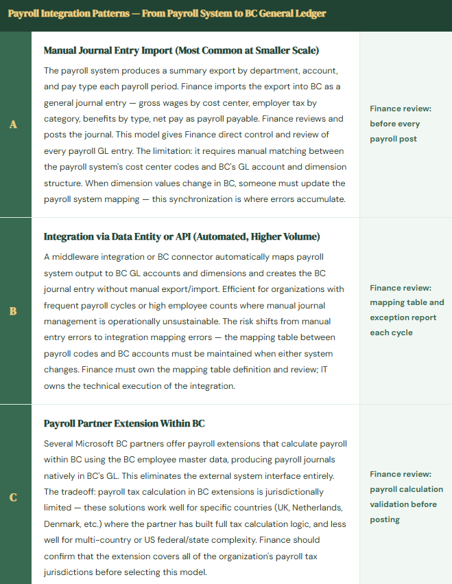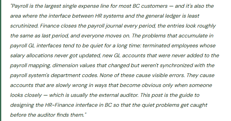 The design implication is straightforward: BC is the financial system of record; the payroll platform is the payroll system of record. The interface between them — how payroll costs move from the payroll system into the BC general ledger — is what Finance must design, control, and reconcile every period.
