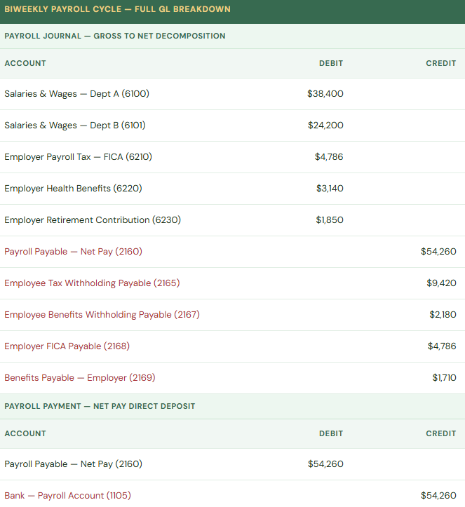 The payroll journal splits the total compensation cost across three layers: the expense (debit to salary and employer-paid benefit accounts), the liability for what is owed to employees (net pay payable), and the liability for what is owed to tax authorities and benefit providers (withholding and employer contribution payables). Finance must verify that each payroll posting leaves these liability accounts with the correct balance for subsequent remittance payments to the IRS/HMRC, benefits providers, and retirement plan. A payroll journal that lumps everything into one “payroll payable” account produces an undifferentiated liability that Finance cannot reconcile against the specific remittances.