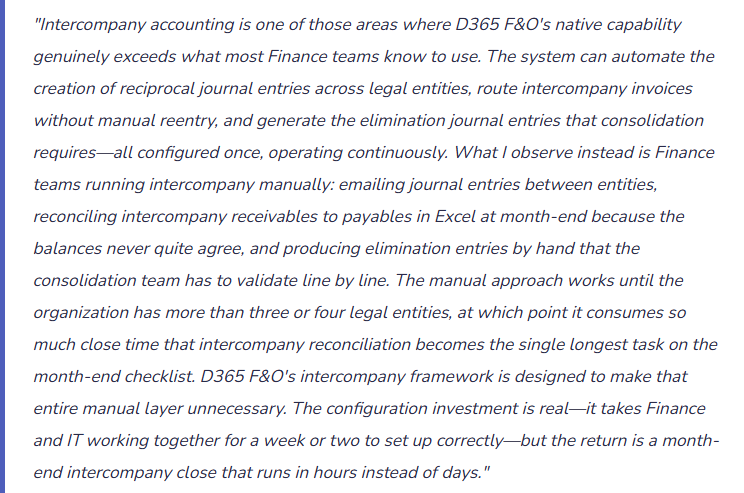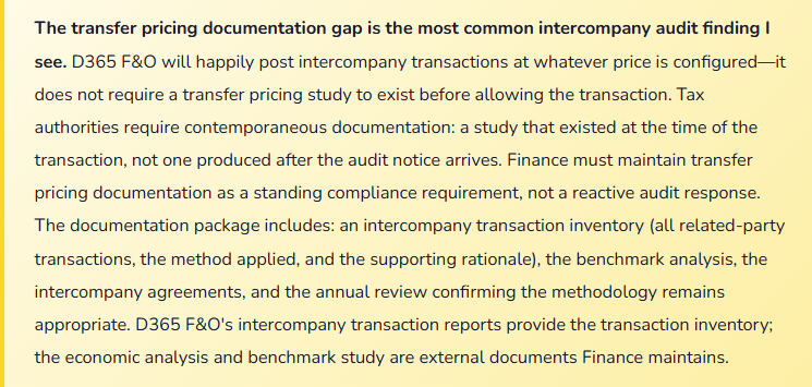 - Assume D365 F&O’s intercompany configuration validates transfer pricing compliance—the system enforces whatever Finance configures, correct or not