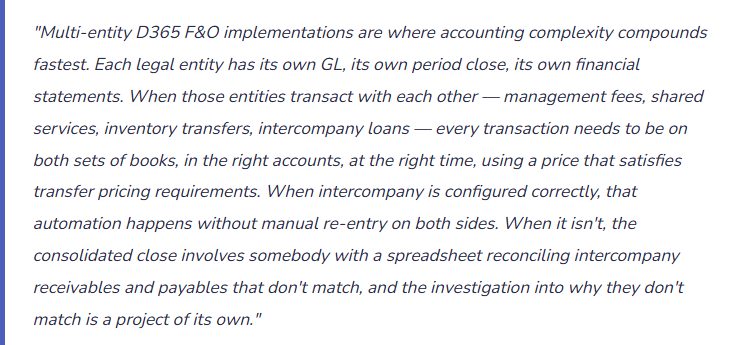 Intercompany covers the multi-entity layer — how D365 connects legal entities in the same instance. Next we’re going into cost accounting at the operational level: Cost Accounting and Cost Management in D365 F&O — the Cost Accounting module, cost objects, cost allocation hierarchies, overhead calculation, and how D365’s dedicated cost accounting layer produces management P&L reporting that the GL alone can’t deliver. For Finance teams who need allocation-adjusted profitability analysis by product line, department, or cost center beyond what financial dimensions provide.