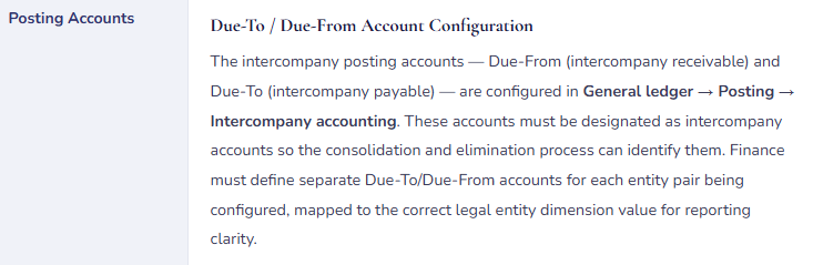- Define intercompany accounts (Due-To / Due-From) in a Finance-owned document, by entity pair