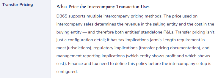The price at which Entity A sells to Entity B isn’t just an intercompany detail — it’s a transfer pricing policy with tax authority scrutiny in every jurisdiction where those entities operate. D365 F&O supports several pricing methods for intercompany transactions, and the choice belongs to Finance and Tax, not to whoever is configuring the intercompany trading relationship in the system.