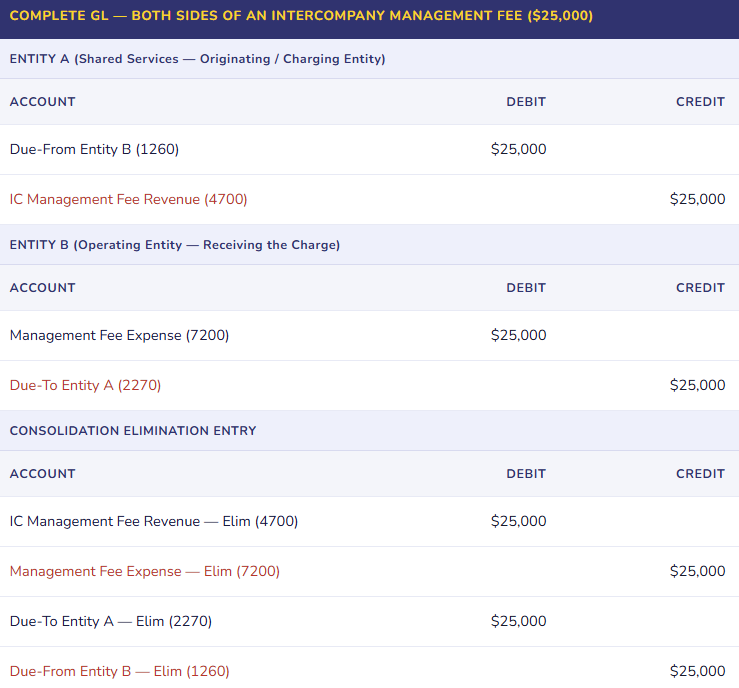 - Entity A: Dr. Due-From B / Cr. IC Revenue