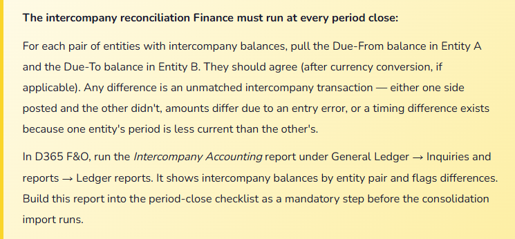 | 5. Verify IC Accounts Net Zero | Financial reports → Trial balance with IC account filter | Any intercompany account with a non-zero balance after eliminations indicates either a missing elimination entry or a timing difference in intercompany posting between entities. Investigate and resolve before releasing consolidated statements. |