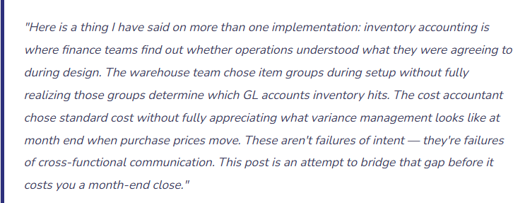 This is why inventory accounting implementations go sideways when Finance and Operations are not in the same room during the design phase. It is not enough for Finance to configure the posting setup correctly if Operations doesn’t understand what their transactions are doing to the general ledger. And it is not enough for Operations to understand their physical processes if Finance hasn’t explained what financial expectations those processes need to meet.
