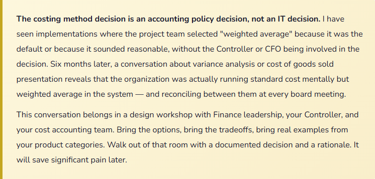 → Make costing method selection a formal, documented design decision with Finance leadership sign-off — including the CFO and Controller, not just the project team. Document the decision, the rationale, and the implications for variance reporting. Store that decision document somewhere it can be retrieved when the question comes up again — and it will come up again.