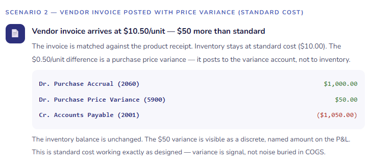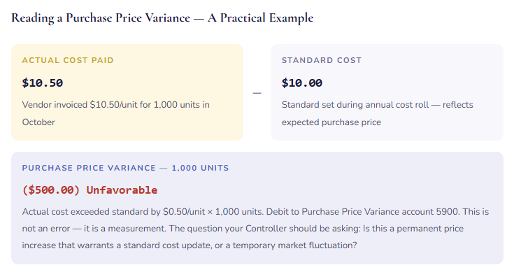 | Purchase Price Variance | Vendor invoice price differs from the item’s standard cost | PPV Account (e.g., 5900) | Is the standard still realistic? Has the vendor’s pricing changed permanently? Should the standard be updated in the next cost roll? |