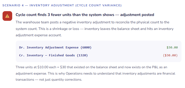 → Require a reason code on every inventory adjustment — and configure Finance-reviewed reason codes that map to meaningful expense account distinctions (shrinkage vs. damage vs. cycle count vs. obsolescence). Set a dollar threshold above which inventory adjustments require a manager or Finance approval before posting. Train your warehouse team explicitly that adjustment = accounting entry, not just quantity correction.