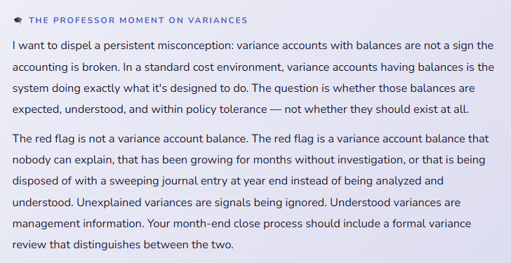 If your organization uses standard cost, variance accounts are not a sign something went wrong — they are the reporting mechanism that shows you where actual costs deviated from plan. The question is not “why do we have variances?” The question is “what are our variances telling us, and are they within acceptable range?”