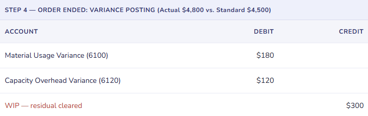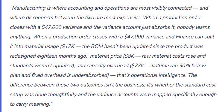 The variance entries in Step 4 are the financial output of the entire production cycle. The accounts they land in — and how specifically those accounts are defined — determine whether your income statement carries operationally useful information or a single undifferentiated “Production Variance” line that Operations ignores because Finance can’t explain it.