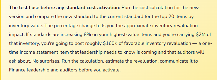 • Fix: Standard cost updates are an annual Finance obligation, not an optional system maintenance task. The process: recalculate standards using current component prices (pull the most recent purchase prices or vendor quotes), update work center rates to reflect current labor and overhead cost structure, activate the new cost version, revalue on-hand inventory, communicate the revaluation impact to Finance leadership. Document the effective date and the basis for the new standards. When standards are current, variance accounts measure performance. When they aren’t, variance accounts measure staleness — and nobody benefits from that.