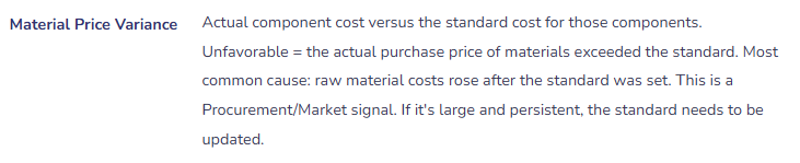 • Review variance account balances monthly — persistent patterns signal a standards or BOM problem