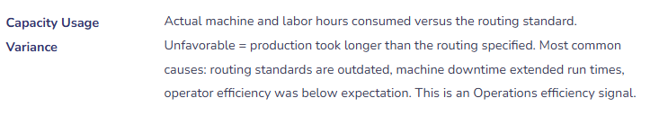 • Fix: Map each variance type to its own GL account in the production posting profile. Material Usage Variance, Material Price Variance, Capacity Usage Variance, Capacity Overhead Variance — each gets an account. The additional accounts cost nothing but a few rows in the chart of accounts. The analytical value is substantial: each month, the variance accounts in the trial balance tell Operations exactly where cost performance deviated from standard, without requiring Finance to build a report to explain it.