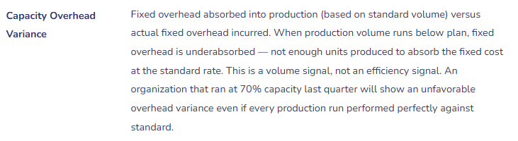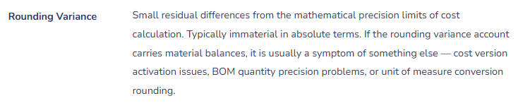 • The production posting profile was configured with one “Production Variance” account receiving all variance types — material usage, material price, capacity usage, capacity overhead, rounding. The income statement shows a single production variance line. It could be $200K unfavorable because material prices rose, $200K unfavorable because volume was low and overhead underabsorbed, or $200K unfavorable because BOMs are stale and more material is being consumed than planned. Finance cannot tell from the trial balance which it is. Every variance explanation requires pulling production detail reports, sorting by variance type, exporting to Excel, and manually aggregating — a 45-minute exercise that could have been a 30-second trial balance review.