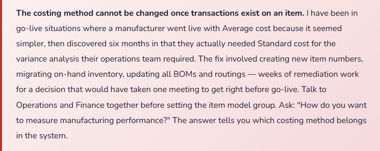 • Accept the costing method default without a deliberate Finance and Operations discussion