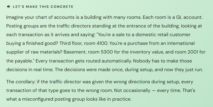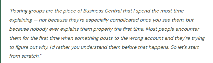 → Take the time to design your posting group structure to reflect the business distinctions that matter for your financial reporting. You don’t need thirty groups — but you probably need more than one. Start with the reports you need to produce and work backward to the groups you need to make them possible.