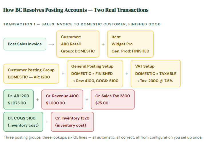 When a customer pays an invoice, which accounts get debited and credited? When you post a purchase order for inventory items, where does the inventory value land? When you ship an order to a customer, where does the cost of goods sold go? None of those answers are hardcoded into BC. They’re determined dynamically, at the moment each transaction posts, based on a set of rules you define during setup.