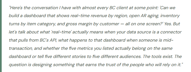 Fix: Validate BC data quality before deploying Power BI dashboards. The most important pre-Power BI data checks: item costs reconcile to vendor invoices, customer and vendor master data is complete and correctly classified, dimensions are consistently applied to transactions. A dashboard built on clean data earns trust immediately. A dashboard built on dirty data surfaces the data problems in the most visible way possible — in front of the audience you most need to trust it.