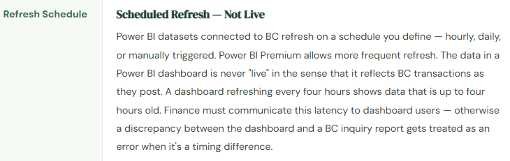 - Assume Power BI shows real-time BC data — it doesn’t; it shows data as of the last scheduled refresh