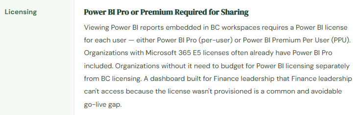 - Forget to budget Power BI Pro licenses for dashboard users separate from BC licensing