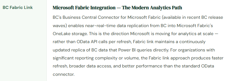 Microsoft’s dedicated analytics layer. Connects to BC via the BC connector or API. Handles trend analysis, cross-entity comparison, operational KPIs, and visualizations BC’s native reporting can’t produce. Data is refreshed on a schedule — not real-time.