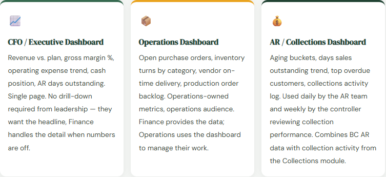 | Executive one-page financial dashboard for leadership | Power BI | A visually designed KPI dashboard with revenue, gross margin, operating expense, cash position, and AR aging — all on one screen with color-coded variance indicators — is Power BI’s native use case. The audience is leadership, not Finance. Power BI’s visual design capability exceeds what BC’s native reports can produce. |