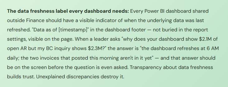 The CFO dashboard refreshes overnight. The CFO reviews it at 9 AM and sees $1.8M of open AR. At 9:30 AM, the controller posts a $220K collection that came in yesterday afternoon — it was just processed this morning. At 10 AM, the CFO asks the controller why AR is at $1.8M when she thought it should be closer to $1.6M. The controller explains that the collection was posted this morning after the dashboard refreshed. The CFO’s confidence in the dashboard drops — “if it doesn’t show today’s numbers, how do I know what it’s showing?”