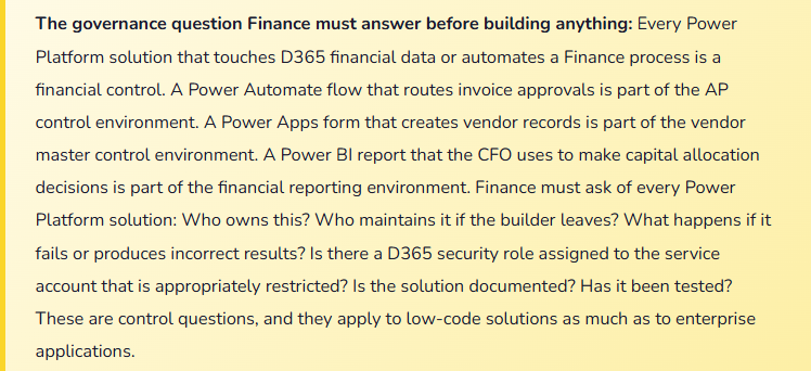 Fix: Power Platform solutions that affect financial workflows, financial data, or financial controls must be inventoried, reviewed, and formally approved by Finance management before they are deployed in production. The governance model: all Power Automate flows and Power Apps that connect to D365 financial data are registered in a solution inventory. Each solution has a named Finance owner (not just the person who built it). New solutions require Finance manager or controller approval before deployment. The service account or user connection used by each solution has a security role that is documented and reviewed in the quarterly user access review. “Someone built it and it was useful” is not a control approval. Treat every Power Platform financial solution like any other financial system change: change management, documentation, testing, and approval.
