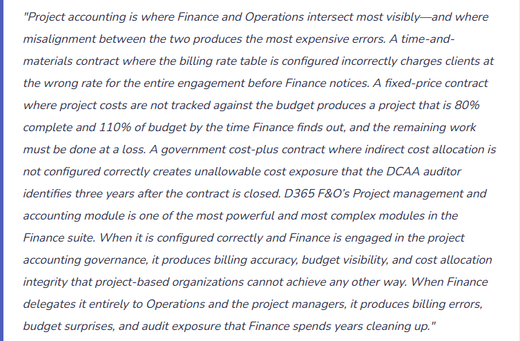 Project accounting and government contract compliance completes the major Finance module arc of this series. The final post steps back from module-level depth to name what I observe across D365 F&O Finance implementations of every size and industry: What Finance Gets Wrong in D365 F&O Implementations—and How to Fix It—the ten recurring Finance failures observed across implementations, the root cause pattern behind each one, and the practical correction that transforms a D365 F&O implementation from a transaction-processing system into the Finance platform the organization actually needs.