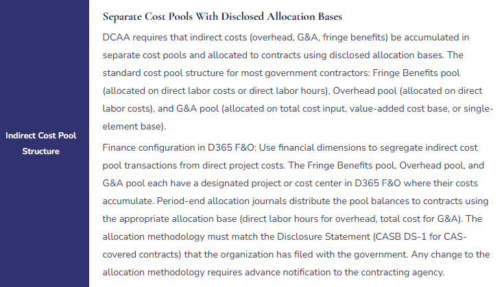 Organizations that hold US government cost-reimbursable contracts are subject to Cost Accounting Standards (CAS) and to audit by the Defense Contract Audit Agency (DCAA). DCAA’s primary concern is that indirect costs are allocated to government contracts in a consistent, disclosed, and equitable manner. D365 F&O must be configured to support four DCAA compliance requirements that Finance owns.