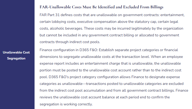 - Finance risk: Unallowable costs that are charged to the project but cannot be billed to the government create cost exposure the company must absorb. DCAA defines allowability criteria; Finance must configure D365 F&O to segregate allowable from unallowable costs at the transaction level.