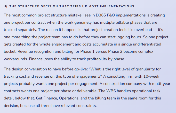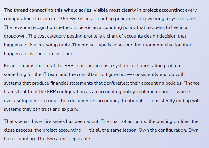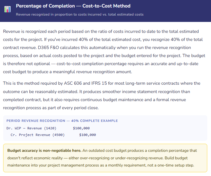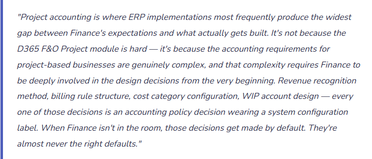→ Make the revenue recognition method selection a formal Finance and auditor decision made before system configuration begins. Document it as an accounting policy. Map the chosen method to the corresponding D365 F&O configuration. If your organization has never had a formal revenue recognition policy for project-based revenue, the D365 F&O implementation is the forcing function to create one — involve your auditors in that conversation, not as a post-implementation check but as an input to the configuration decision.