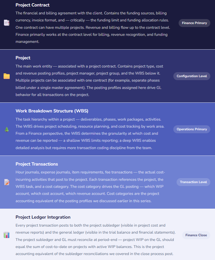 Project types, contracts, cost categories, revenue recognition methods, WBS structure, billing rules, and the GL integration that Finance teams need to own — for the organizations where project accounting is the whole financial story.