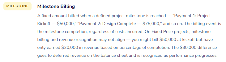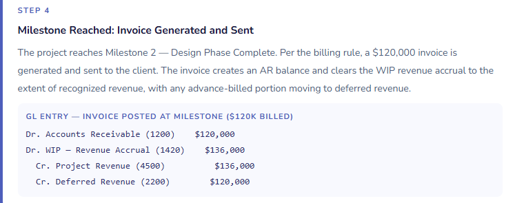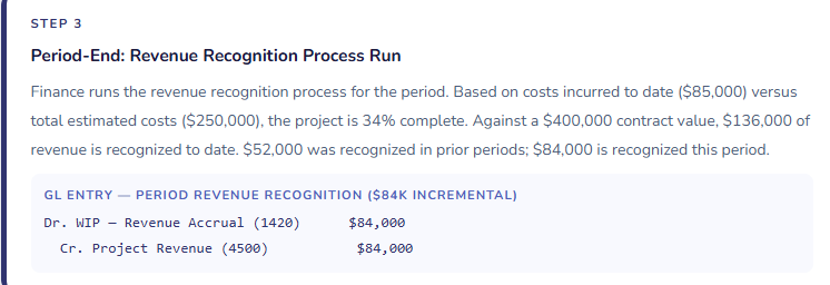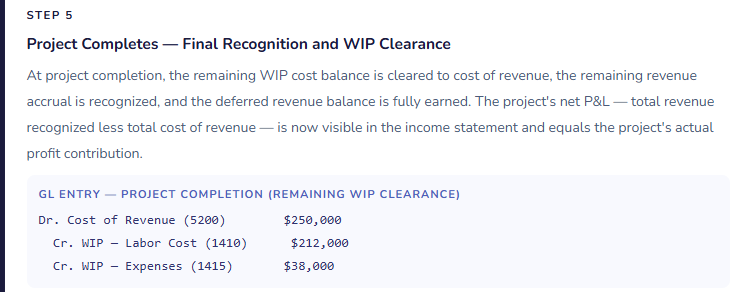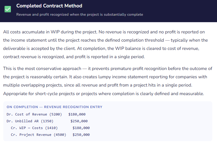 - The client pays a contracted amount regardless of actual costs. Revenue recognition is the complex part — completed contract, percentage of completion (cost-to-cost or effort-based), or sales value method. Costs accumulate in WIP until revenue is recognized. Billing may be milestone-based and may not align with revenue recognition timing.
