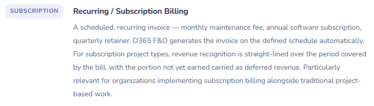 - A recurring billing arrangement — subscription fees, maintenance contracts, retainer arrangements. Revenue is recognized ratably over the subscription period (straight-line across months), and billing can be in advance (creating deferred revenue on the balance sheet) or in arrears. A relatively newer project type in D365 F&O designed specifically for recurring revenue businesses.