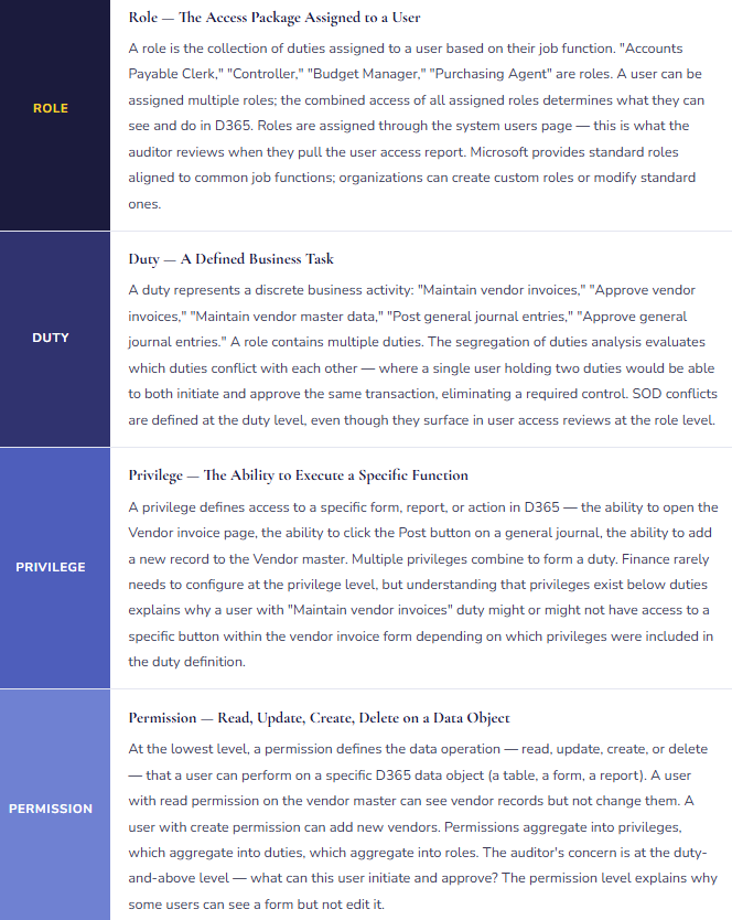 D365 F&O’s security architecture is a hierarchy: roles contain duties, duties contain privileges, and privileges contain permissions. Understanding how the layers relate is essential for Finance to participate meaningfully in security design — and to understand what an auditor means when they flag a “role-level conflict.”