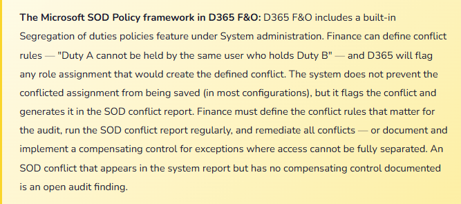 Segregation of duties (SOD) requires that no single user has the combined ability to initiate and complete a transaction without a second person’s involvement — the fundamental control that prevents both error and fraud from going undetected. In D365 F&O, SOD conflicts occur when a user’s combined role assignments give them duties that should be held by different people.