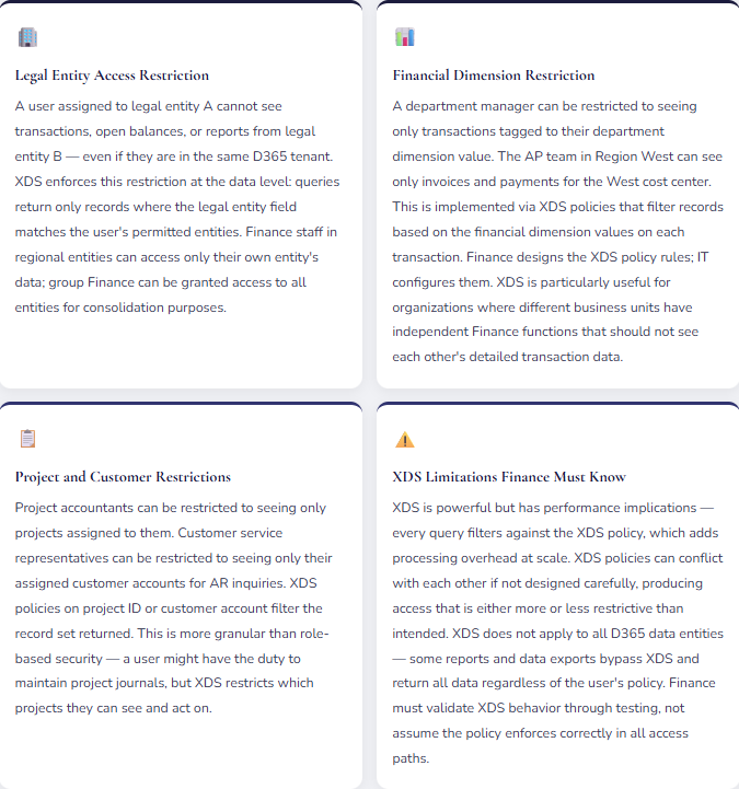 Fix: For any D365 F&O environment with multiple legal entities that require financial data separation, XDS policies restricting access by legal entity are required — not optional. Finance must define which user groups (roles) have access to which legal entities. Group Finance oversight roles may have access to all entities; entity-level Finance roles are restricted to their assigned entity. The XDS policy must be tested: attempt to access a restricted entity as a restricted user and confirm the data is filtered. Test not just the main form access but report outputs, exported data, and data entity-based integrations — XDS does not apply universally across all access paths and testing must confirm coverage across the paths Finance actually uses.