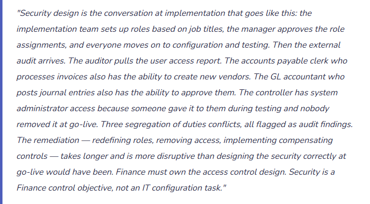- Design security roles based on what’s convenient and let audit findings drive the SOD design retroactively — remediation after go-live is more disruptive than design before go-live