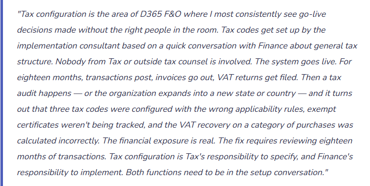 - Treat tax configuration as final at go-live — tax law changes require ongoing maintenance