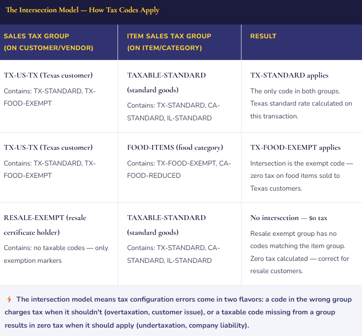 D365 F&O determines the applicable tax rate for any transaction through the intersection model — a deliberate design that separates “who is this transaction with?” from “what is being transacted?” and applies the tax code only when a specific combination of both conditions is met.