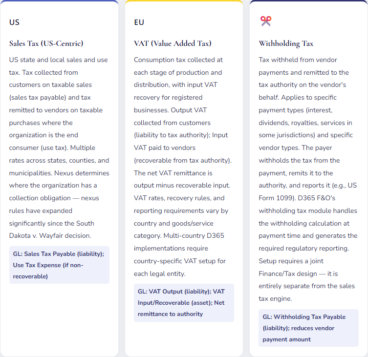 The sales tax engine, tax groups and item tax groups, the intersection model, VAT for multi-country implementations, withholding tax, tax-exempt scenarios, and the configuration mistakes that produce financial statement misstatements that survive undetected until a tax authority asks questions.