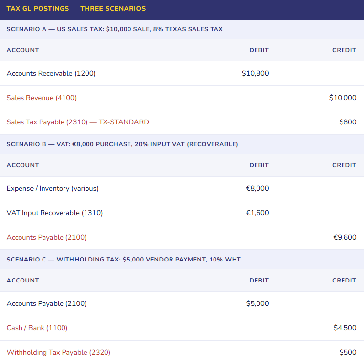 | Reverse Charge VAT | Cross-border B2B services and certain goods categories shift VAT liability from the supplier to the buyer under reverse charge rules. The buyer accounts for both output VAT (owed) and input VAT (recoverable) simultaneously — net cash impact is zero for fully recoverable businesses but both entries must post. | Failing to configure reverse charge results in no VAT posting on transactions that require it — an understatement of both VAT output liability and input recovery in the VAT return. Tax authorities specifically audit cross-border transaction VAT treatment. |